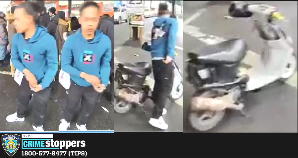 The NYPD released surveillance video of the suspect and his moped. He is described as a male with a light complexion who is 5 foot 6. He has a slim build and a ponytail. He was last seen wearing a light blue hooded sweatshirt, white sneakers and black sweatpants.
